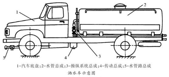 灑水車是以汽車底盤作為基礎(chǔ)車,其工作裝置由水罐總成2、傳動裝置4、管路系統(tǒng)5及操縱系統(tǒng)3組成。如圖所示。