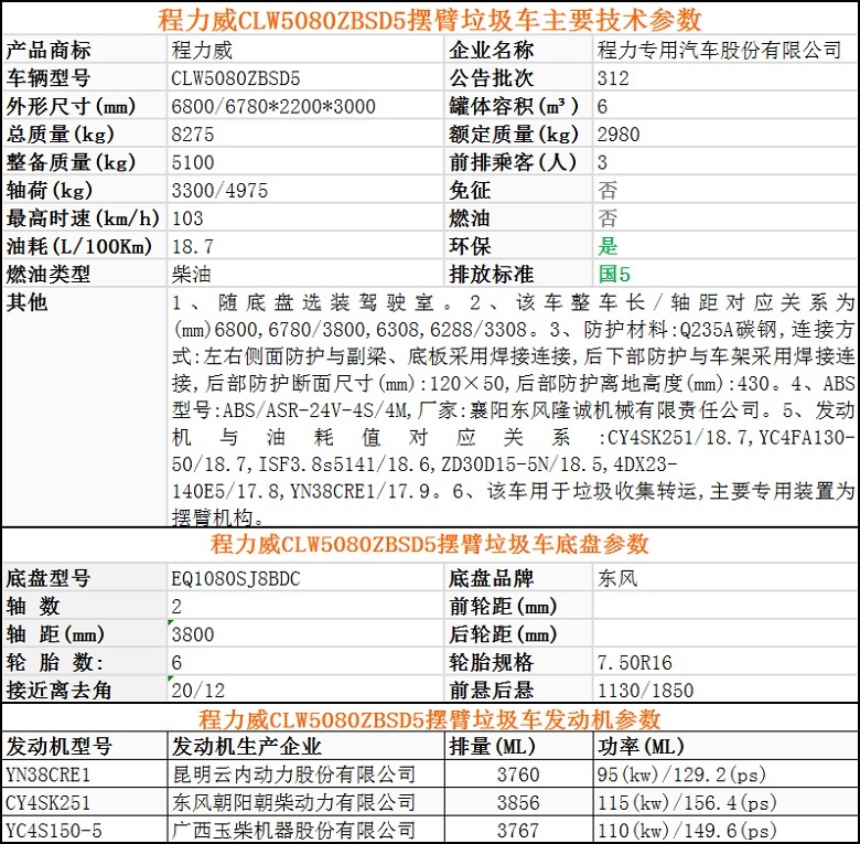 采用東風(fēng)原裝底盤,EQ1110SJ8BDC 國(guó)五 多利卡D7,脂玉白,軸距3800,2030單排前翻轉(zhuǎn)駕駛室,發(fā)動(dòng)機(jī)國(guó)五朝柴 CY4SK251,156馬力;一汽錫柴4DX23-140E5,140馬力,變速箱6A120(6TS55)萬(wàn)里揚(yáng)6擋變速箱,前后橋2.2/4.2T(2.5/5.5T配8.25R16),192mm寬的變截式大梁,板簧8/10+7,輪胎8.25R16鋼絲胎、方向助力、斷氣剎、電動(dòng)車窗、中控鎖、ABS、帶原廠空調(diào)。