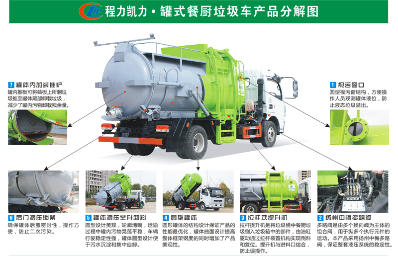 餐廚垃圾車,又稱餐余垃圾車、余廚垃圾車或者泔水車,是用于收集和運(yùn)輸生活垃圾、食品垃圾(泔水)及城市淤泥的專用車輛,改裝部分具有裝、卸垃圾自動(dòng)化程度高、工作可靠、密封性好、裝載容積大、操作簡便、作業(yè)過程密閉,無污水泄露和異味的散發(fā),環(huán)保性好等特點(diǎn)?膳溲b載不同規(guī)格的標(biāo)準(zhǔn)垃圾桶,具有廣泛的適用性。