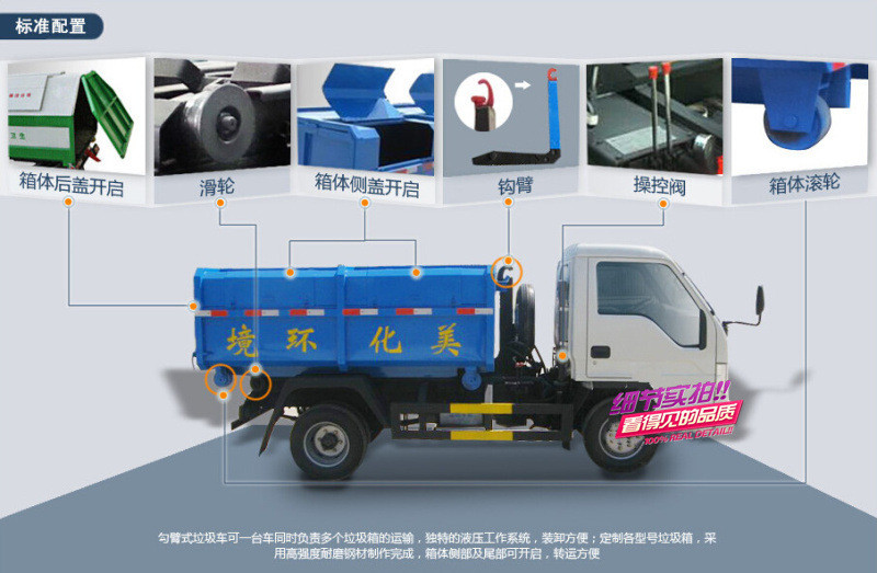 鉤臂垃圾車(chē)又稱(chēng)為車(chē)廂可卸式垃圾車(chē),用全液壓控制操作系統(tǒng),垃圾廂與底盤(pán)可徹底分離,具有結(jié)構(gòu)合理,操作簡(jiǎn)便、穩(wěn)定、使用效率高、密封性能好、傾倒方便等優(yōu)點(diǎn),能實(shí)現(xiàn)一臺(tái)車(chē)與多個(gè)垃圾廂聯(lián)合作業(yè),循環(huán)運(yùn)輸,充分提高車(chē)輛的運(yùn)輸能力。主要適用于市政環(huán)衛(wèi)、物業(yè)管理、大型廠、工礦等各種場(chǎng)所收集、運(yùn)載各種垃圾。