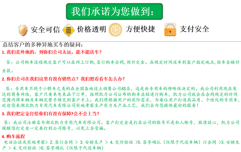 | 2、購(gòu)車(chē)流程: | 1、咨詢(xún)洽談(電話(huà)洽談或來(lái)廠(chǎng)考察洽談) 2、簽訂汽車(chē)購(gòu)銷(xiāo)合同(傳真、郵遞或者來(lái)廠(chǎng)簽訂) 3、我廠(chǎng)按時(shí)按質(zhì)生產(chǎn) 4、交付驗(yàn)收 >>點(diǎn)擊查看詳細(xì)內(nèi)容 |