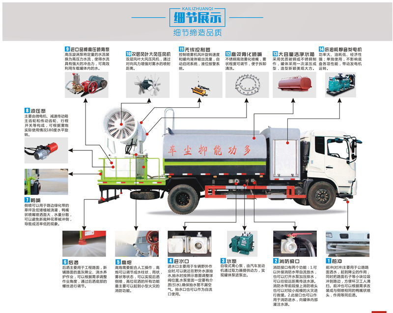 多功能抑塵車,城市、工地、廠區(qū)降塵利器,工作效率約為普通灑水車的30倍,工作直徑可覆蓋4個標(biāo)準(zhǔn)足球場。水箱中的水經(jīng)過霧化后,由高壓風(fēng)機噴出水霧顆粒極為細(xì)小,達(dá)到了微米級,其吸附力也增加了3倍,耗水量卻降低了70%,遭遇霧霾天氣、PM2.5嚴(yán)重超標(biāo)時,進(jìn)行液霧降塵、可將飄浮在空氣中的污染顆粒物、塵埃等迅速逼降地面,達(dá)到清潔凈化空氣的效果。