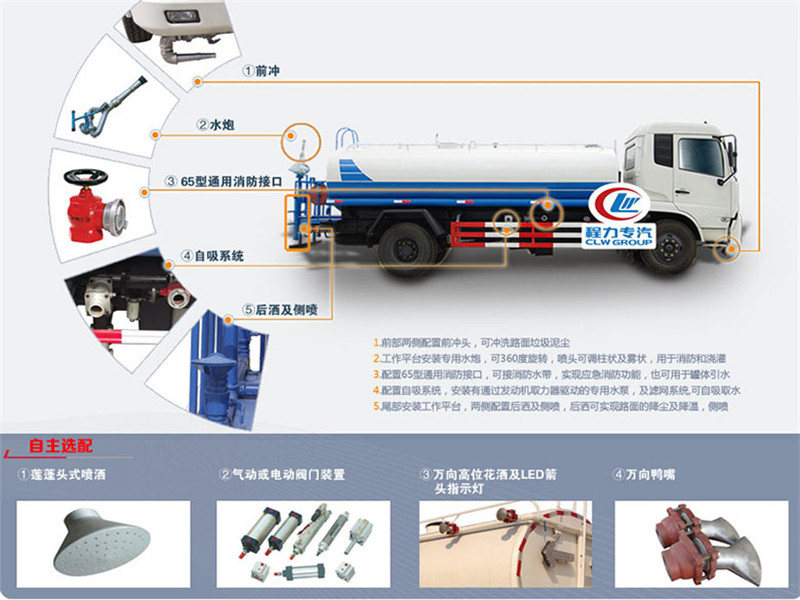 前噴后灑,前裝有鴨形噴嘴或圓頭沖嘴,后面裝有圓柱開灑水噴嘴或蓮蓬頭噴嘴,后部有一工作平臺,裝配有高壓水炮。后部還可裝8個噴嘴(選裝)噴水器一般用于沖洗街道。