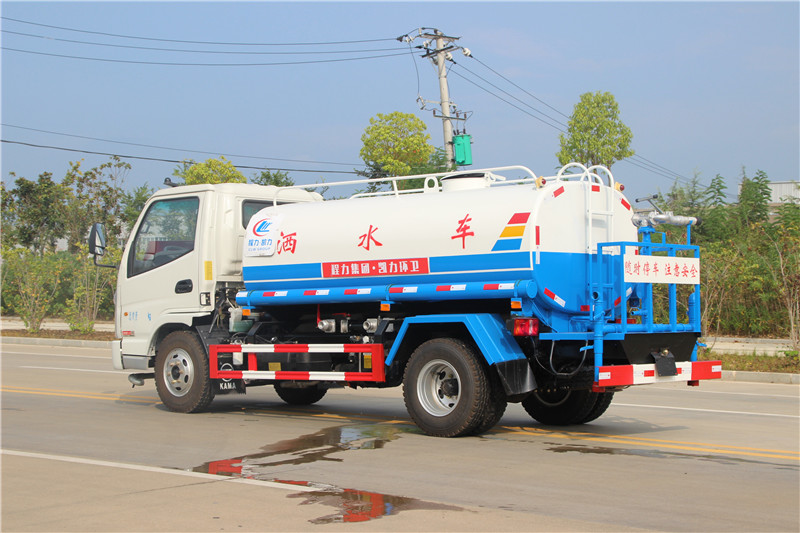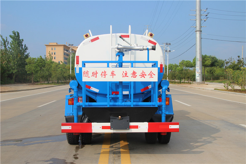 前噴后灑,前裝有鴨形噴嘴或圓頭沖嘴,后面裝有圓柱開灑水噴嘴或蓮蓬頭噴嘴,后部有一工作平臺(tái),裝配有高壓水炮。后部還可裝8個(gè)噴嘴(選裝)噴水器一般用于沖洗街道